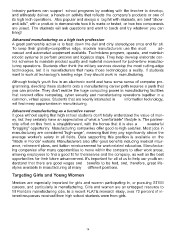 Industry partners can support school programs by working with the teacher to develop, and ultimately deliver, a hands-on activity that reflects the company’s products or one of its high tech operations. Also popular and always a big hit with students, are brief “show- and-tells”, with a product to demonstrate how it is made or tested, or how two components are joined. The students will ask questions and want to touch and try whatever you can bring! Advanced manufacturing as a high tech profession A great partnership action is to beat down the dull and dirty stereotypes once and for all. To keep their globally-competitive edge, modern manufacturers use the most ad- vanced and automated equipment available. Technicians program, operate, and maintain robotic systems to perform process and logistics steps. They help develop elaborate con- trol schemes to maintain product quality and material movement for just-in-time manufac- turing operations. Students often think the military services develop the most cutting-edge technologies, but it is manufacturers that make those technologies a reality. If students want to work at technology's leading edge, they should work in manufacturing. Although today’s youth live in an electronic world and have some sense of computer pro- gramming, directing these students onto a manufacturing career path requires a push that you can provide. They don't realize the huge computing power in manufacturing facilities that connect office computing, cyber security and manufacturing operations together in a common, virtual space. Students that are keenly interested in information technology, will find many opportunities in manufacturing. Advanced manufacturing as a lucrative career It goes without saying that high school students don't totally understand the value of mon- ey, but they certainly have an appreciation of what a “comfortable” lifestyle is. The partner- ship effort on this front is straightforward, with the bonus that it is also a wonderful “bragging” opportunity. Manufacturing companies offer good-to-high salaries. Most jobs in manufacturing are considered “high-wage”, meaning that they pay significantly above the average worker’s salary in all fields. Data supporting this position is available on the “Made in Florida” website. Manufacturers also offer good benefits including medical insur- ance, retirement plans, and tuition reimbursement for work-related education. Manufactur- ing companies offer many opportunities to move within the company to other work areas, allowing employees to find a good fit for themselves and the company, as well as the best opportunities for their future advancement. It’s important for all of us to help our youth un- derstand that there are good wages and benefits to be had, and, therefore, great life- styles available in manufacturing at many different positions. Targeting Girls and Young Women Mentors are especially important for girls and women participating in, or pursuing STEM careers, and particularly in manufacturing. Girls and women are an untapped resource to fill Florida’s manufacturing jobs. In a recent FLATE research study, over 70 percent of in- terest responses received from high school students were from girls. 14