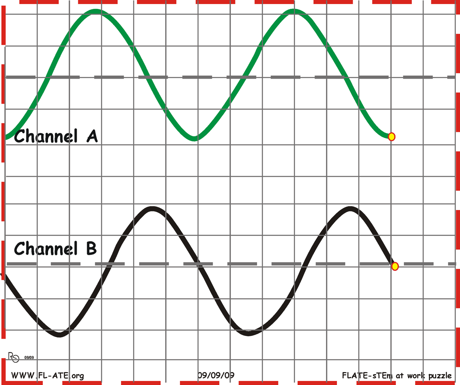 The operational status of a robotic arm that does precision welding for Tampa Armature Company is evaluated by the relationship between the voltage applied across the arm’s control circuit and the current that flows through that control circuit. In one part of the test procedure, the current signal and the voltage signal are supposed to be 45 degrees out of phase. The two signals are in phase when they go up and down together, and 180 degrees out of phase when one is at its maximum value and the other is at its lowest value. The cartoon below is an attempt to imitate the voltage and current signals measured during this part of the test procedure.