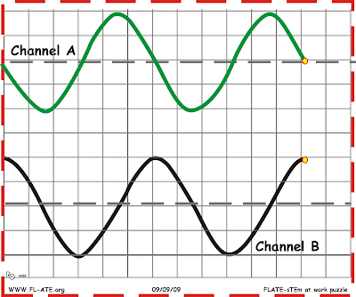 The Tech is checking the operation of an alternative energy system that uses capacitors to store and release a flow of charge, electrons on a wire, and knows that when operating correctly this electron flow, current, and the corresponding voltage do not go up and down together. They are not in phase. In fact, the voltage goes down after the current goes down, that is, the voltage “lags” the current. In the oscilloscope cartoon below, the system’s voltage signal is connected to Channel B and the current signal is connected to Channel A.