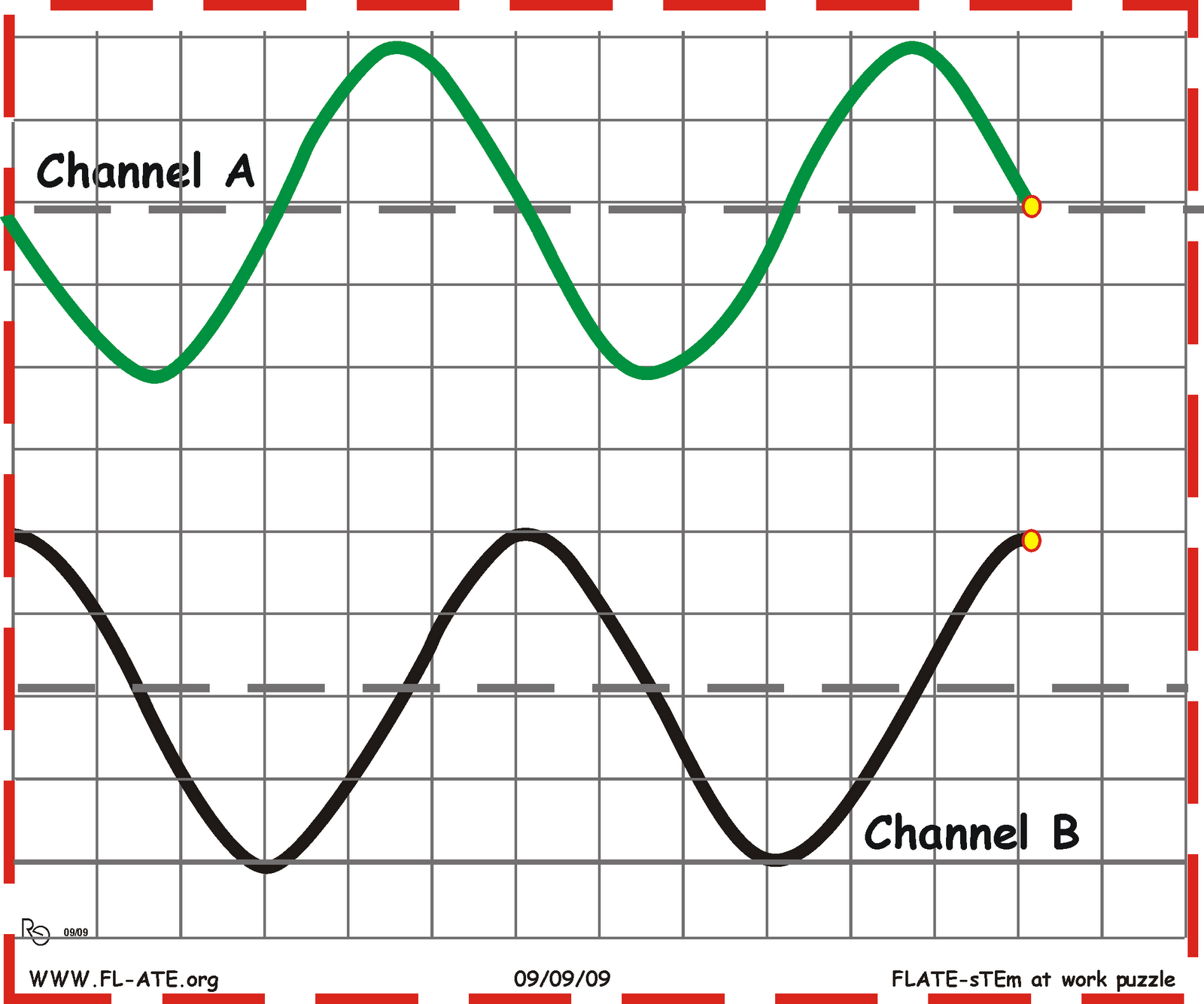 The Tech is checking the operation of an alternative energy system that uses capacitors to store and release a flow of charge, electrons on a wire, and knows that when operating correctly this electron flow, current, and the corresponding voltage do not go up and down together. They are not in phase. In fact, the voltage goes down after the current goes down, that is, the voltage “lags” the current. In the oscilloscope cartoon below, the system’s voltage signal is connected to Channel B and the current signal is connected to Channel A.