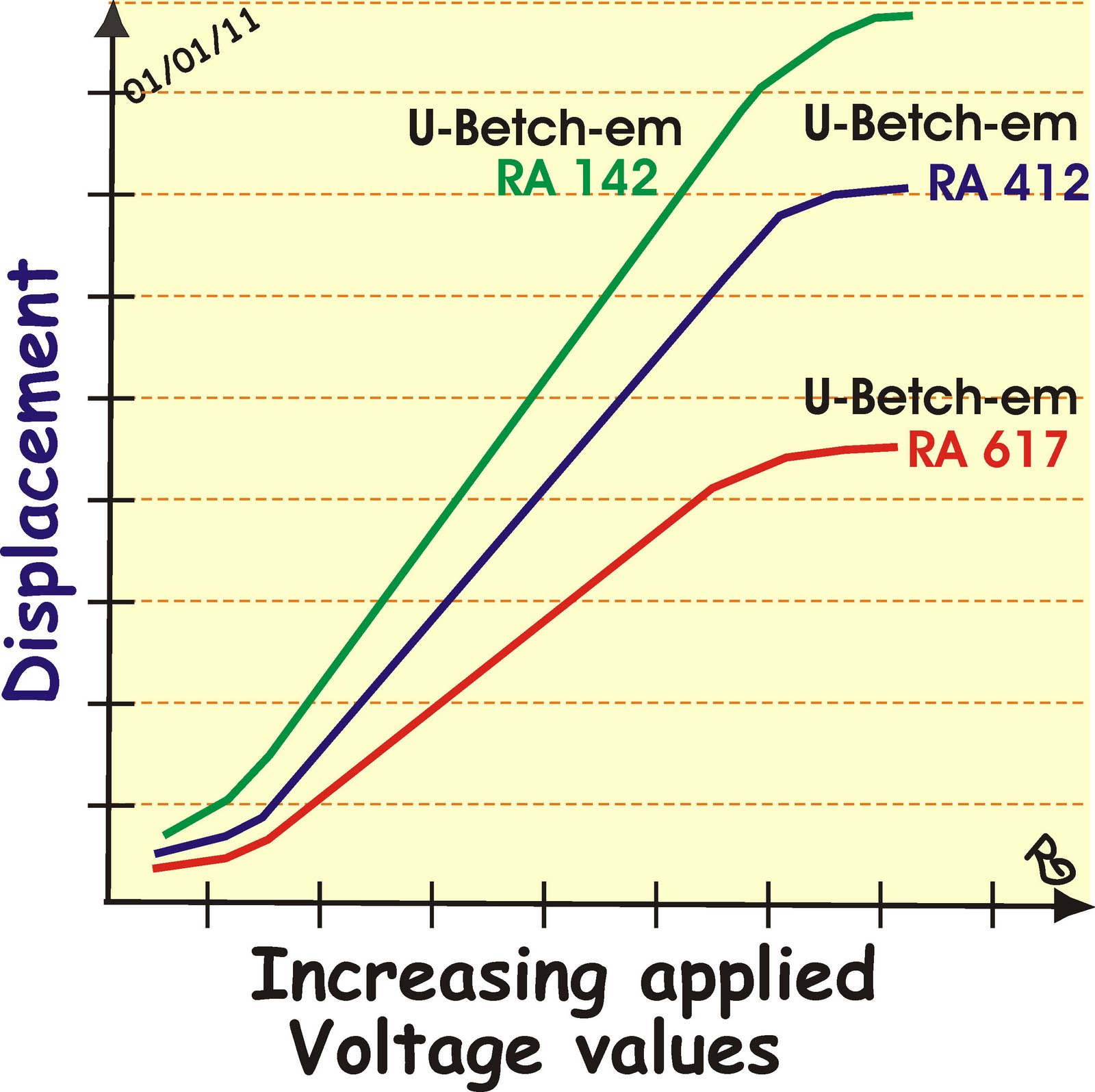 A technician working for a shipyard that retrofits robotic arms for lifting cargo into storage compartments has just completed a computer controlled test of three new robotic arms (purchased from the Robotic Arm Division of the “U-Betch-em” Company) that have just been installed in the vessel cargo compartment. The computer has plotted the voltage verses displacement data for all three arms. The technician knows that the voltage the computer applies to the robotic arm is directly proportional to the force the arm can use to lift an object and that, for the same value of applied voltage, “U-Betch-em” RA-142 is the arm that can do the most work. Now, the Tech must label the computer plots and then print the graph out for the robot arm commissioning report that must be file.