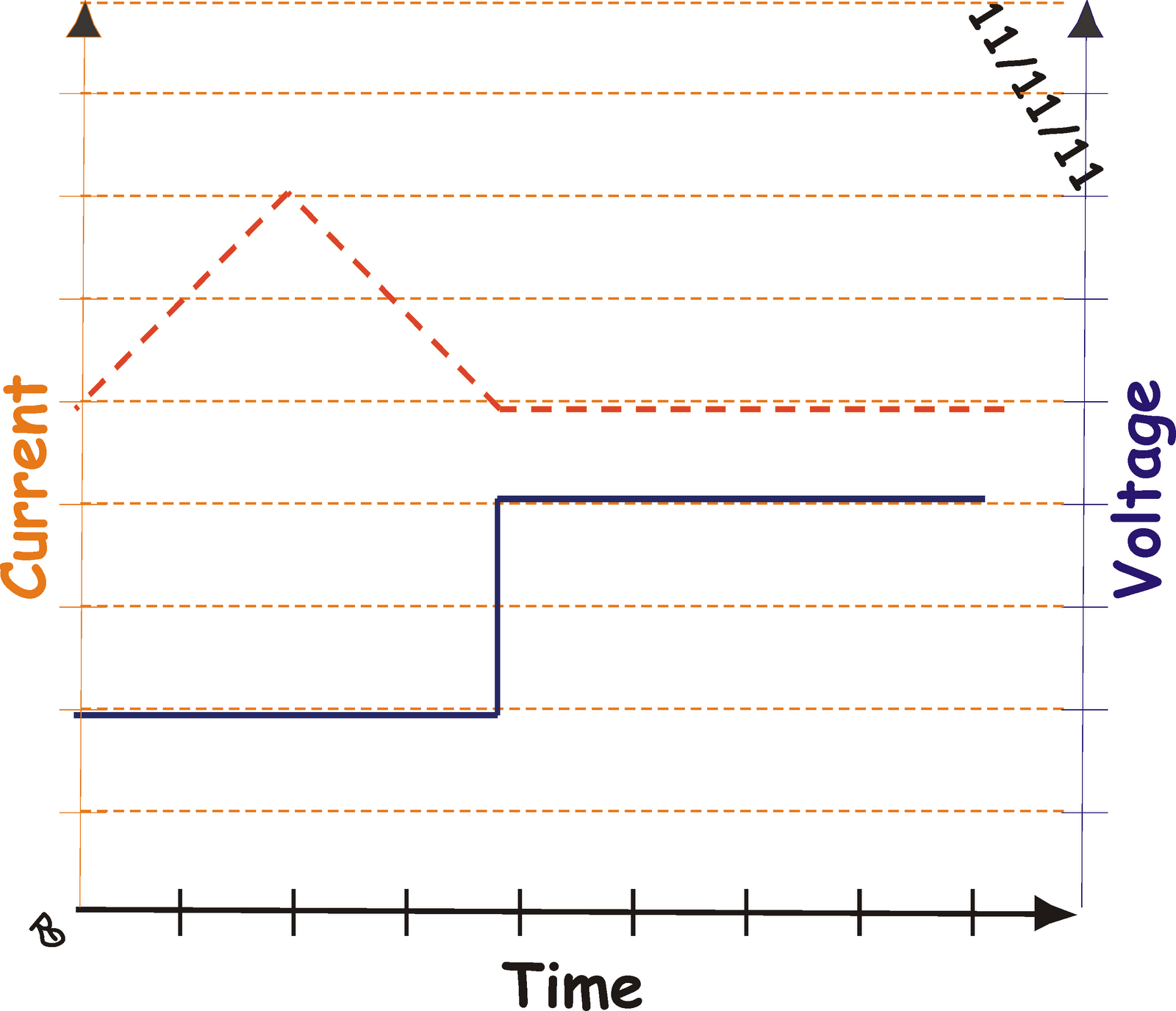 The subsystem under test has a current voltage behavior that is characteristic of an inductor. For this type of subsystem, the voltage needed is proportional to rate the current changes with time. The technician recorded values of current (the orange dotted curve) and voltage (the blue solid curve) verses time for the subsystem circuit being tested and examined the graphs of that data for an expected pattern.
