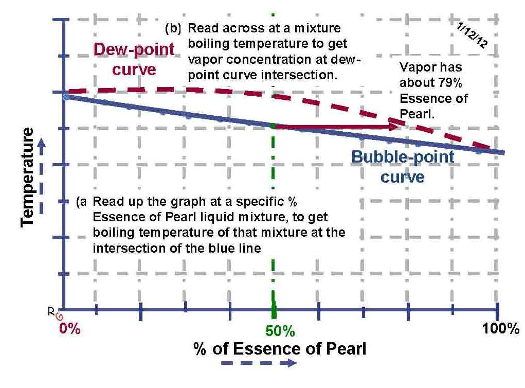 The mixture of two pure liquids creates a third liquid as well as a unique vapor that is generated by that liquid. These binary liquid diagrams are great for really showing students how to read multiple information graphs. The common error when reading this diagram is the presumption that the answer is obtained at the ordinate value intersection with the abscissa at 50%. The actual vapor content is obtained by reading up at 50 % “Essence of Pearl” line until it intersects with the Bubble-point curve for the boiling point of that mixture and then read along the horizontal line at that temperature to determine the % “Essence of Pearl” in the vapor about that boiling liquid mixture at the Dew-point curve intersection. This puzzle is a great way to end a discussion about mole fractions of mixtures. It is also a way to emphasis that just because the liquid is 50% of each of its two liquid components, the vapor of that mixture is not also 50% of each component. The fact that a liquid mixture can be 50% of each type of liquid but the vapor has much more of one of the liquids molecules is a hard idea for students to accept but a critical concept in understanding distillation.