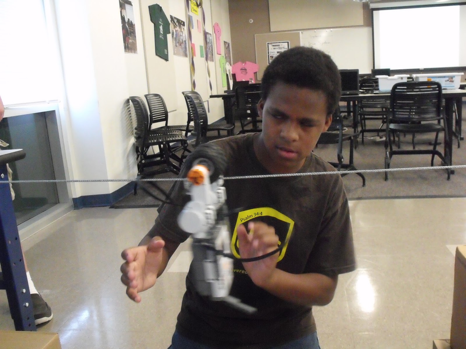 As part of the high school challenge, campers were presented with the “cable tram challenge.” Campers had to design, build and program a robot to crawl across a make-believe canyon to pick up buckets and transport them back to a drop-off location. For Randy, a 9th grader at Wesley Chapel High School in Tampa and his team (named Hyperion Inc.) one of the basic concepts that they had to understand about the robot was the drive train. Once they got that figured out everything was smooth sailing, in that theirs was the only robot that never slipped off the wire.
