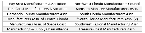 FLATE would like to thank FloridaMakes for organizing the events with the RMA’s and also the following participating Regional Manufacturers’ Associations who hosted these events. For more information, contact Dr. Marilyn Barger (barger@fl-ate.org).
