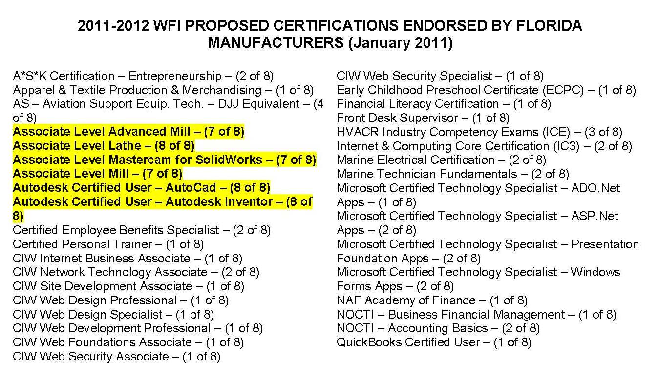 FLATE recognizes the importance of industry certifications and its value to manufacturing employers, and has played a leading role in ensuring high school career and technical programs align with relevant industry certifications. In September 2009, FLATE identified 96 certifications on the current approved list of industry certifications compiled by Workforce Florida Incorporated (WFI). FLATE developed a survey tool and the list was reviewed by the Center’s Industrial Advisory Committee, four engineering technology college program advisory boards (St. Petersburg College, State College of Florida, Brevard Community College and College of Central Florida) and two Banner Center for Manufacturing focus groups held in Jacksonville and Sarasota, FL between September 2009 and September 2010 for a total of 52 respondents. Ranking the 96 listed certifications by frequency resulted in 19 certifications obtaining 20 or more affirmative votes.