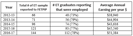 FLATE uses the Florida Education and Training Placement Information Program (FETPIP) data to track employment of engineering technology (ET) grads and to learn about their earning outcomes.
