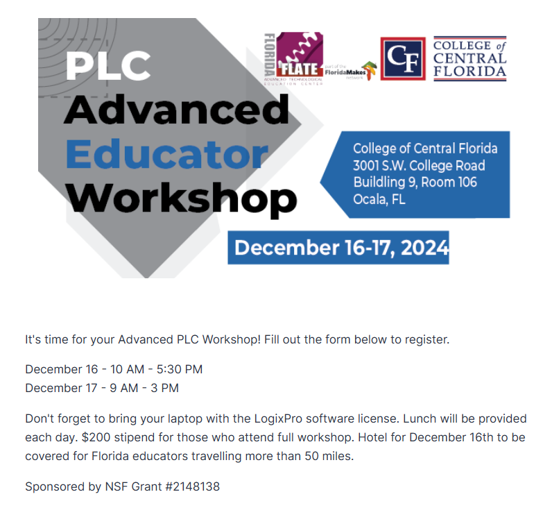 - Programmable Logic Controllers (PLC) Workshops – Cohort of educators completed beginner, intermediate and advanced PLC training from August 2023 to December 2024 taught by Sam Ajlani, College of Central Florida.
